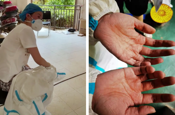 在长沙某小区 ,一名采样人员出现中暑症状;xc sports,xc体育采样人员双手被汗水泡得发白、发皱